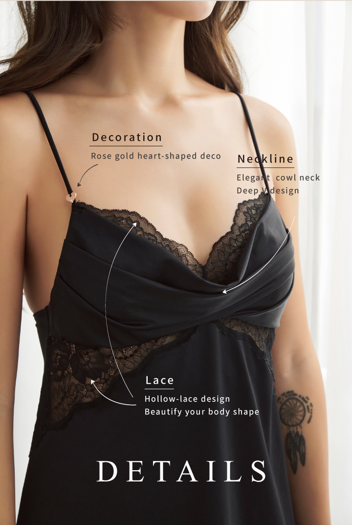 Features a deep V-neckline with draped lace-trimmed cups for a feminine allure.