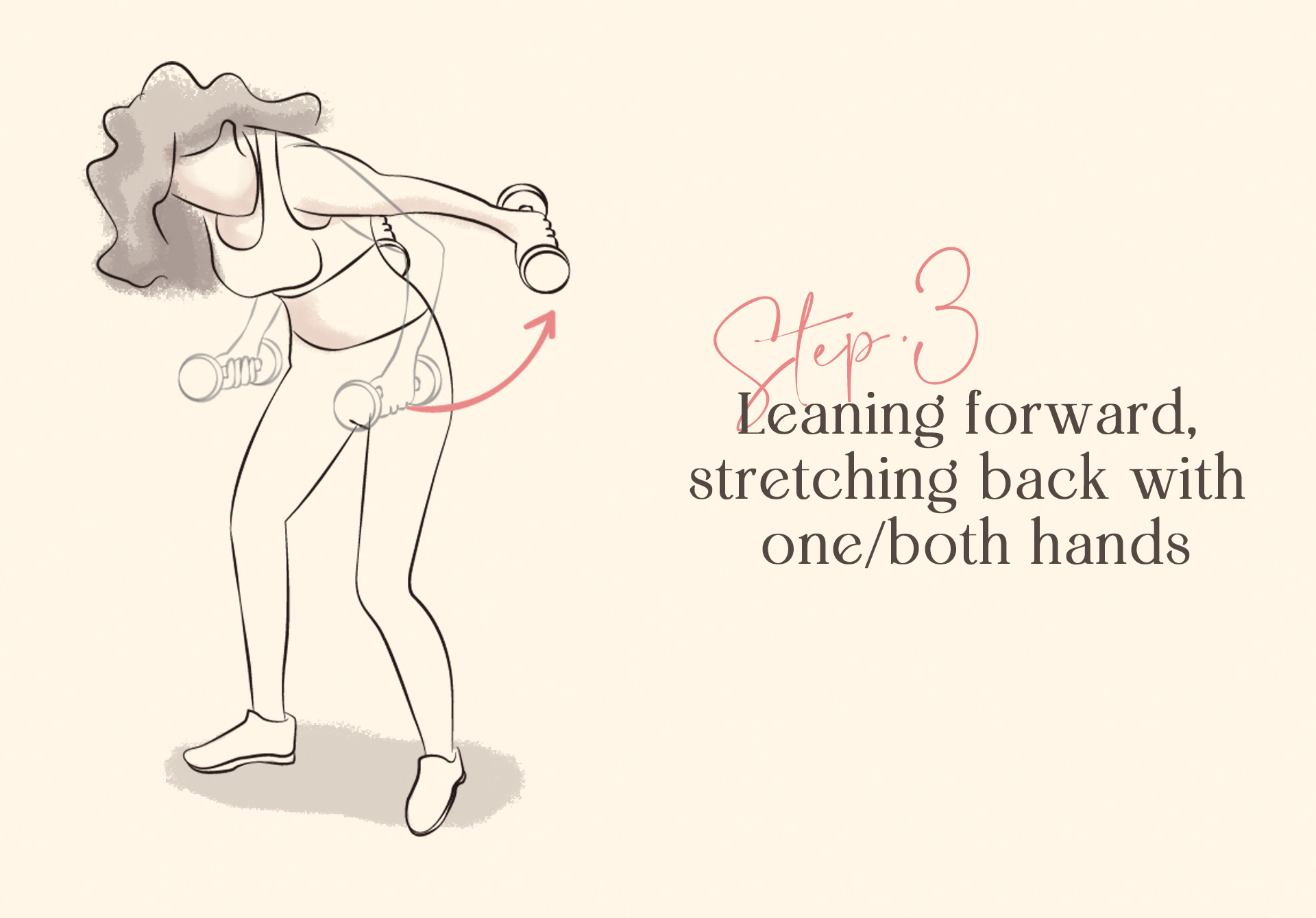 Hold dumbbells (or water-filled bottles) in your hands, and stand with feet slightly apart, knees not extending beyond the toes. Sit back with your buttocks, leaning slightly forward. Keep your upper arms parallel to your body, fix your upper arms, and extend your forearms straight back, then return to the original position.