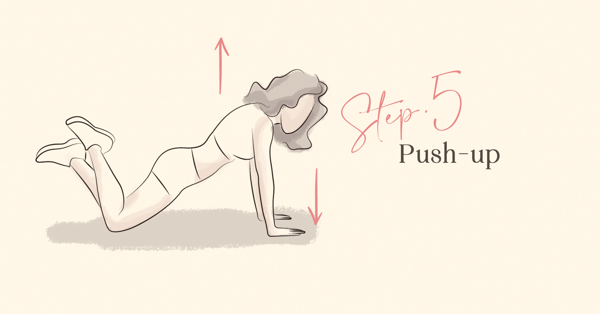 Put your palms below your shoulders, your pelvis tilted forward, and your buttocks clenched. This exercise will require more chest, arm, and core strength.