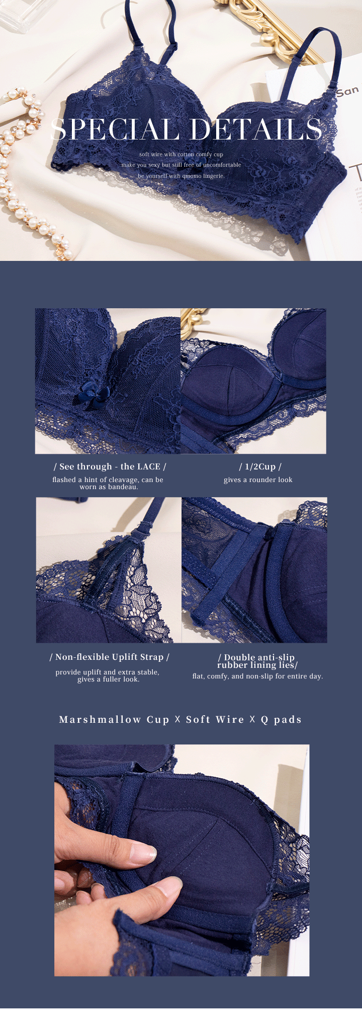 Delicate lace fabric with marshmallow cup, soft underwire, good elasticity Q pads :