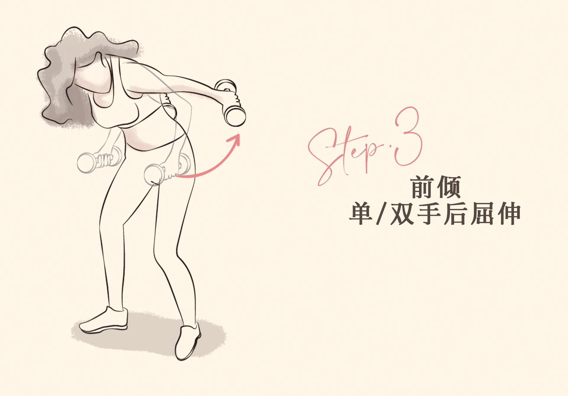 手持哑铃(或是装满水的宝特瓶),双脚微蹲、膝盖不超过脚尖;屁股往后坐,身体微微前倾。上手臂平行上身,固定上手臂,手肘以下往后方伸直再回到原位。