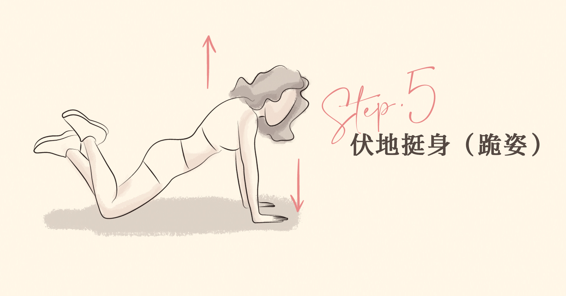 起始动作留意手掌位于肩膀下方,骨盆往前收、屁股夹紧。这个动作会需要使用到更多胸肌、手臂、和核心的力量。