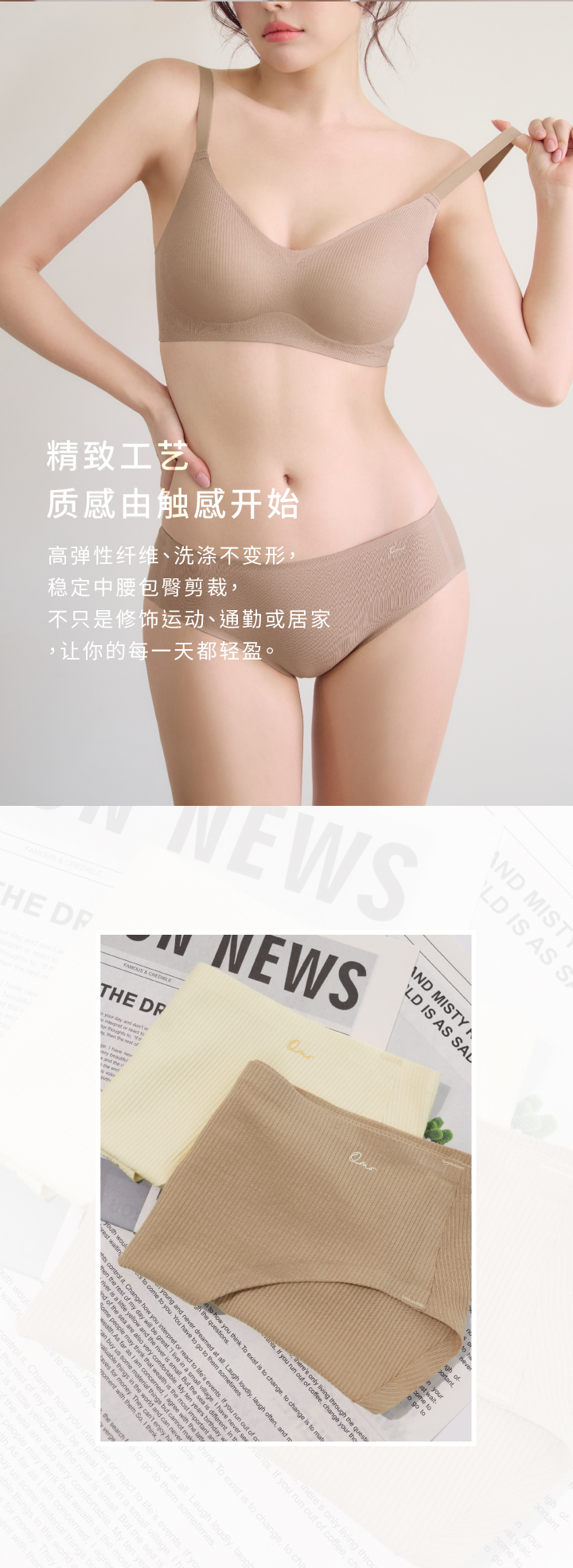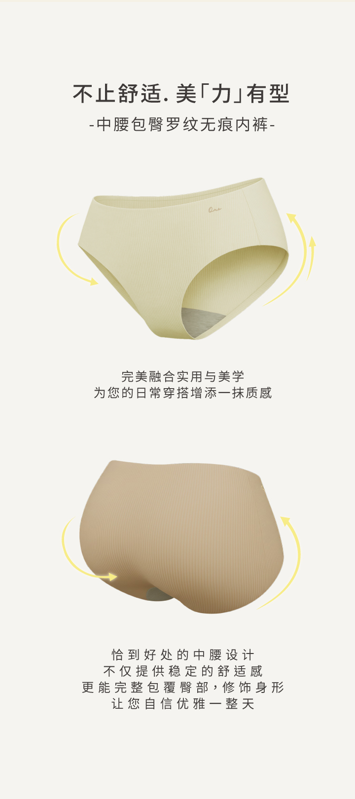 中腰包臀版型,穿着舒适安心。罗纹 Free Cut 随型剪裁,设计简约不单调,棉感亲肤不刺激。