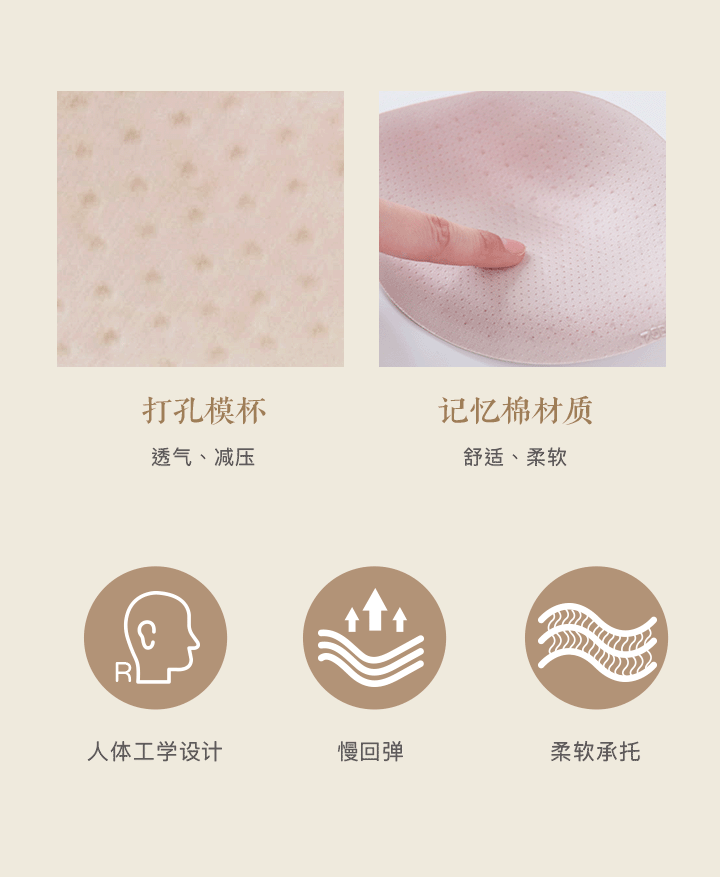 独家开发舒眠枕头杯,透气、减压,温柔支撑,给胸部一个好的睡眠。​