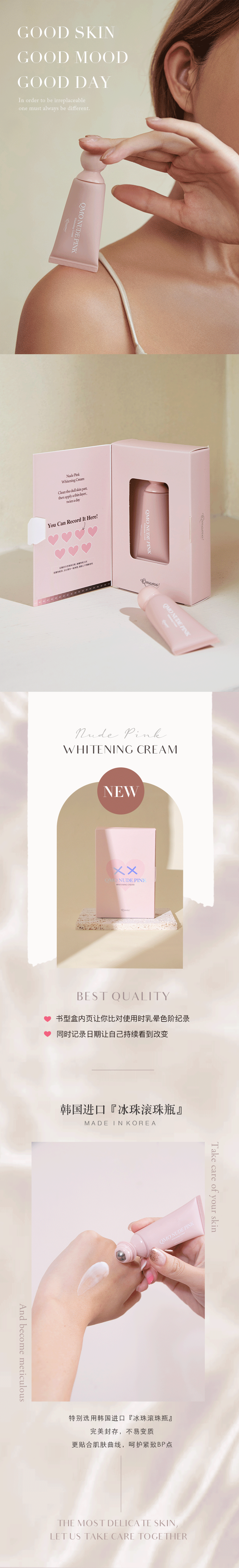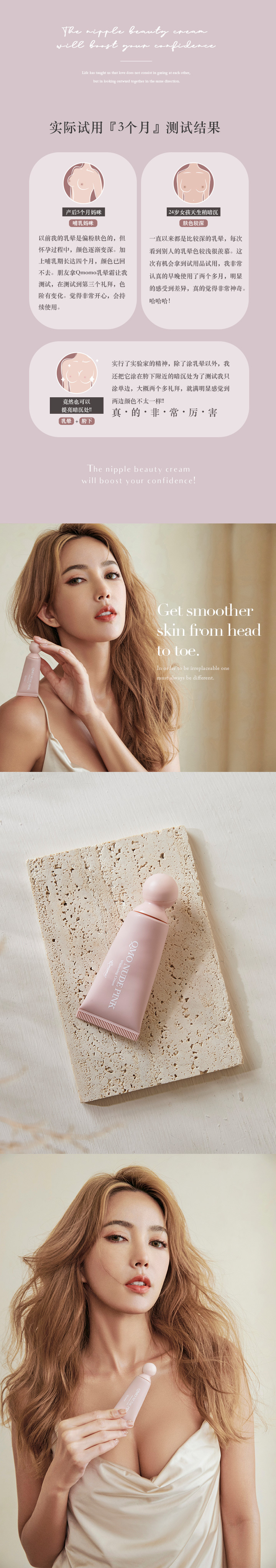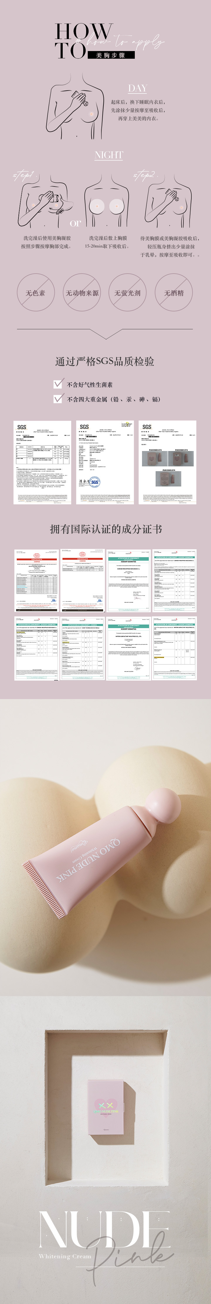 乳霜自带温感配方,美化胸部肌肤,挤出少量乳霜,涂抹于背、耳后肌肤一天,并观察是否会产生刺激或不适。