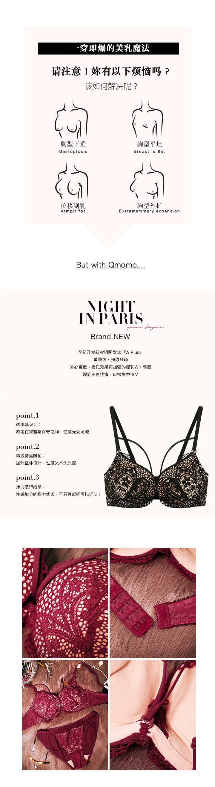 Qmomo 裸漾夜巴黎W钢圈W Plus爆乳內衣(酒紅)