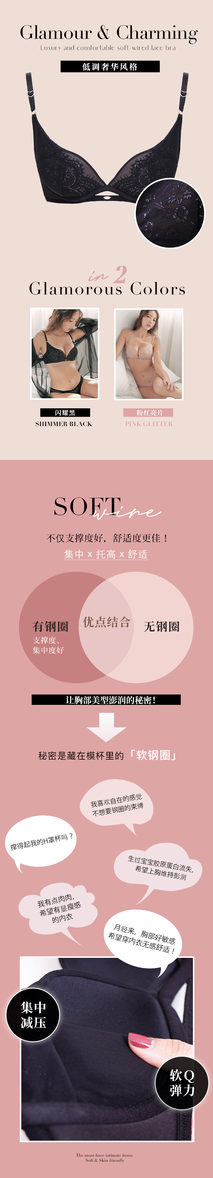 一体成型的舒适软钢圈模杯,减压又舒服