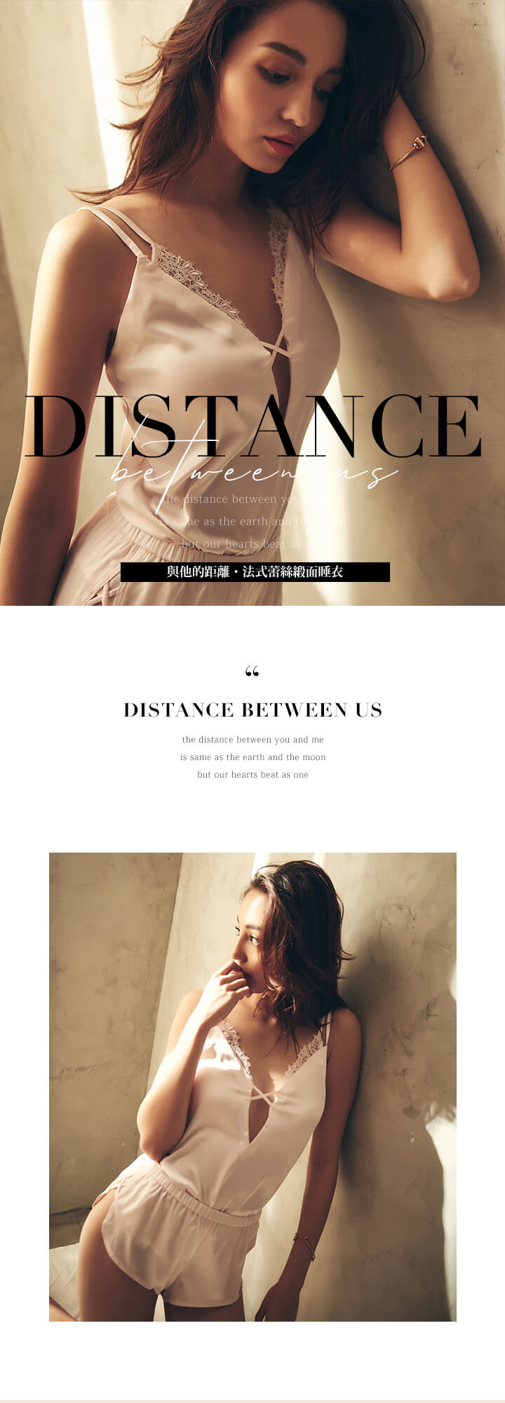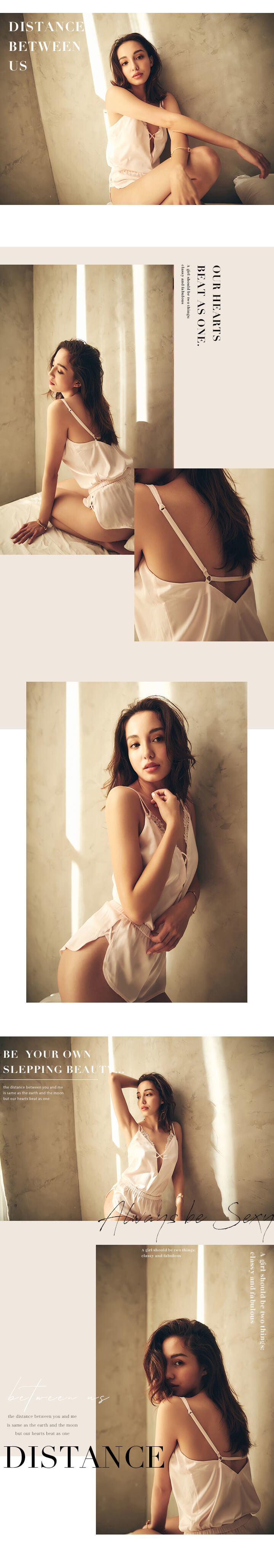 Qmomo【与他的距离】极深V法式蕾丝缎面睡衣上衣 (粉白)